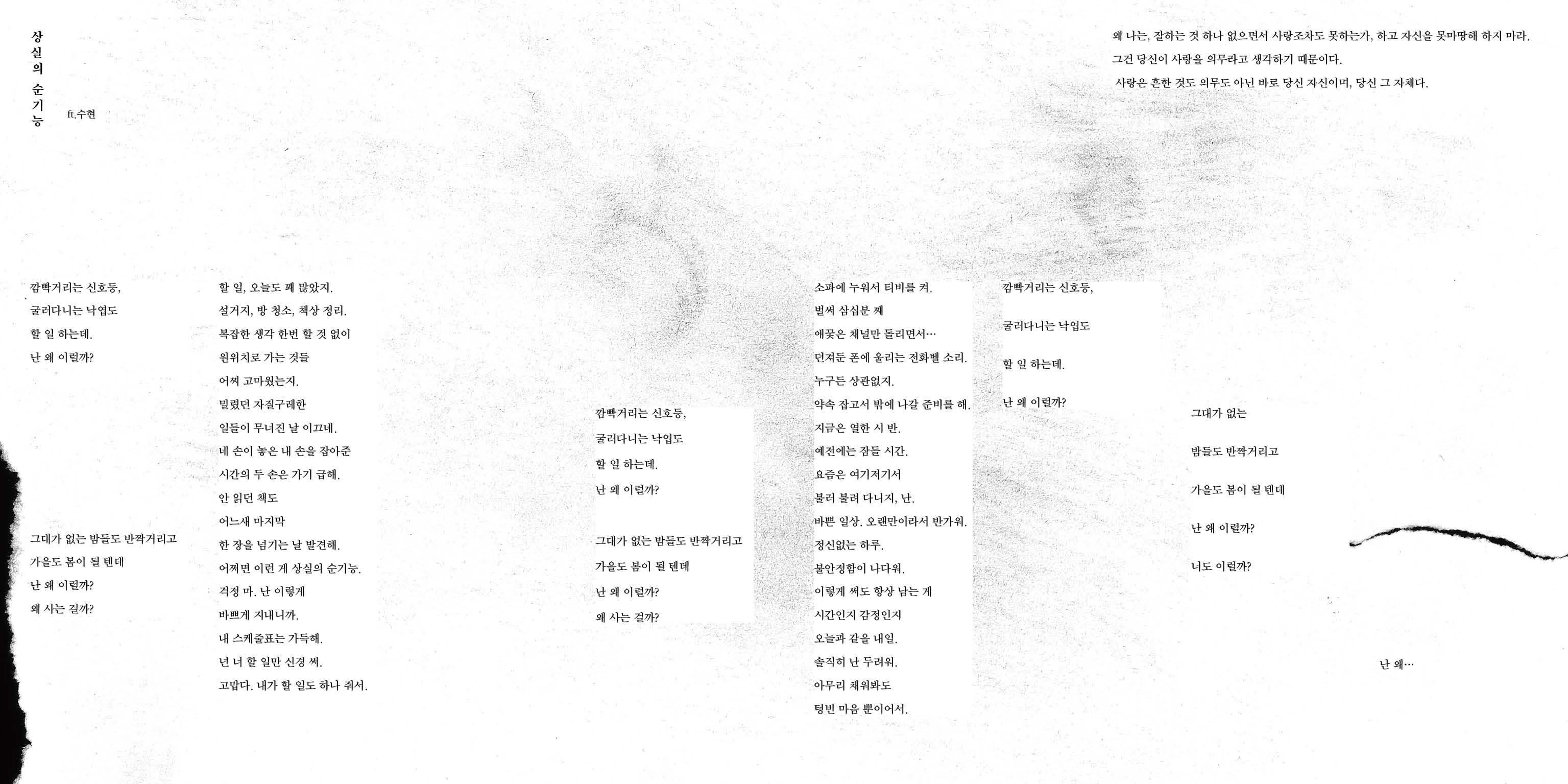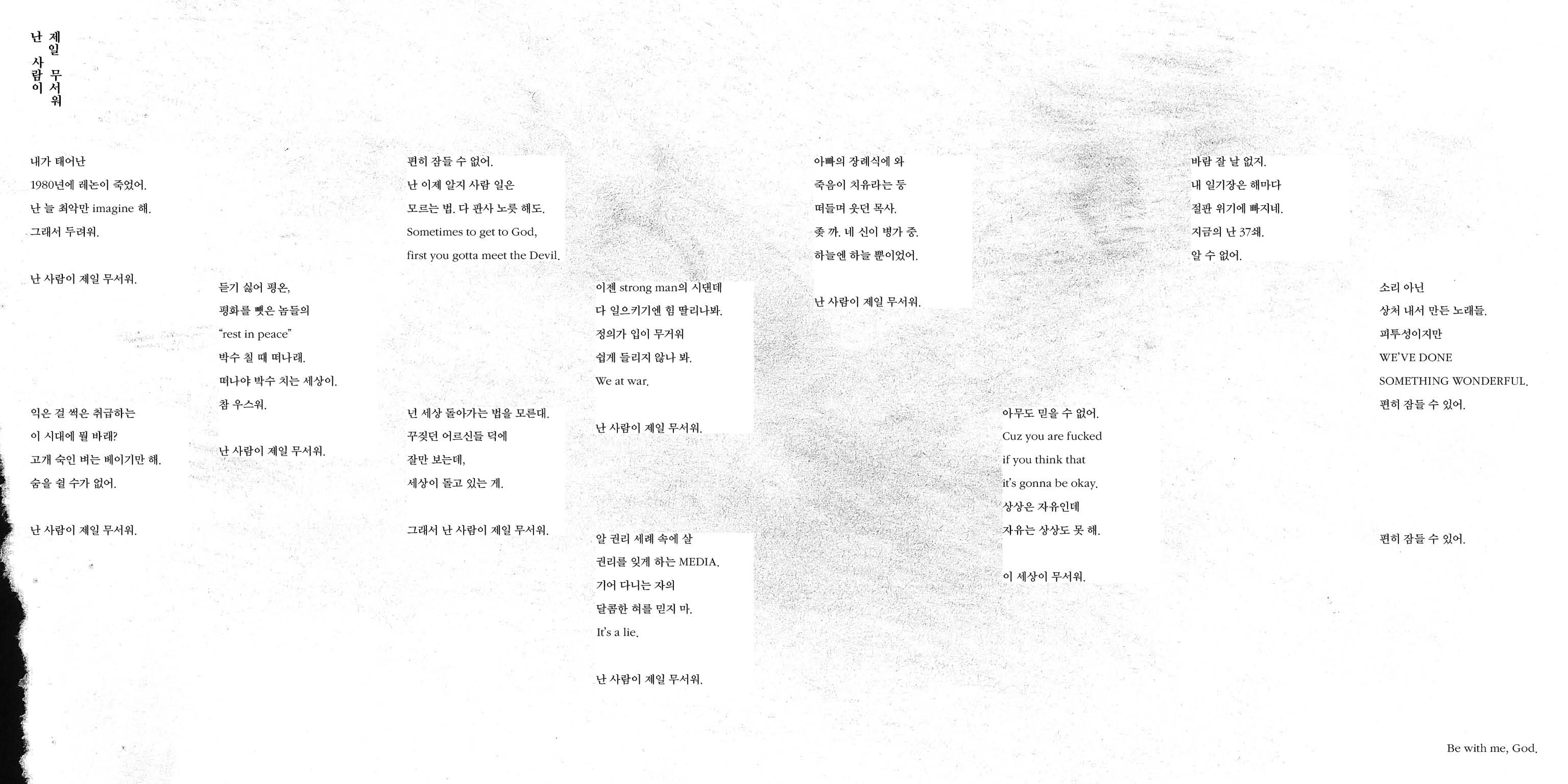 13살때, 누나의 엠피쓰리로 에픽하이 1집을 처음 들었었습니다. 앨범 전체를 재생하고 어안이 벙벙했던 기억이 아직 까지 남아있습니다. 아마도 음악이라는 것을 그때 처음 느낀것 같습니다. 에픽하이 9집을 들으며 이미지들이 떠올라 리커버 디자인을 하였습니다. 제가 느낀 이번 앨범의 전체적인 분위기는 고통과 희망이었습니다. 앨범을 디자인하는데 있어 가장 영감을 받았던 가사는 첫 트랙인 <난 사람이 제일 무서워>에서 ‘소리아닌 상처내서 만든 노래들’이라는 가사였습니다. 노래를 만드는데 드는 고통의 순간들을 잘 드러낸 부분이라고 생각합니다. 가삿말을 연필을 문댄 종이와 찢어진 종이로 표현하였습니다.
